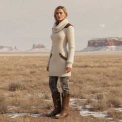 Vestido Feminino Slim Fit Off-White com Gola Alta e Painéis em Couro