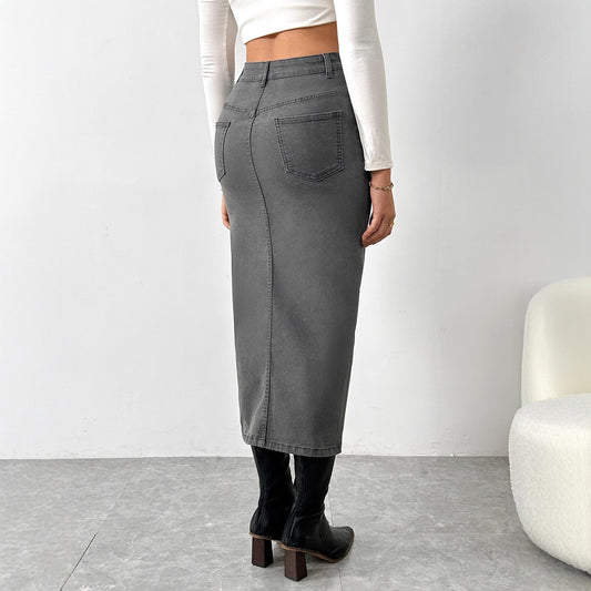 Womens Solid-Color High-Waist Vintage Denim Skirt