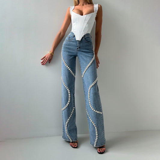 Calça Jeans Feminina Reta com Aplicação de Strass