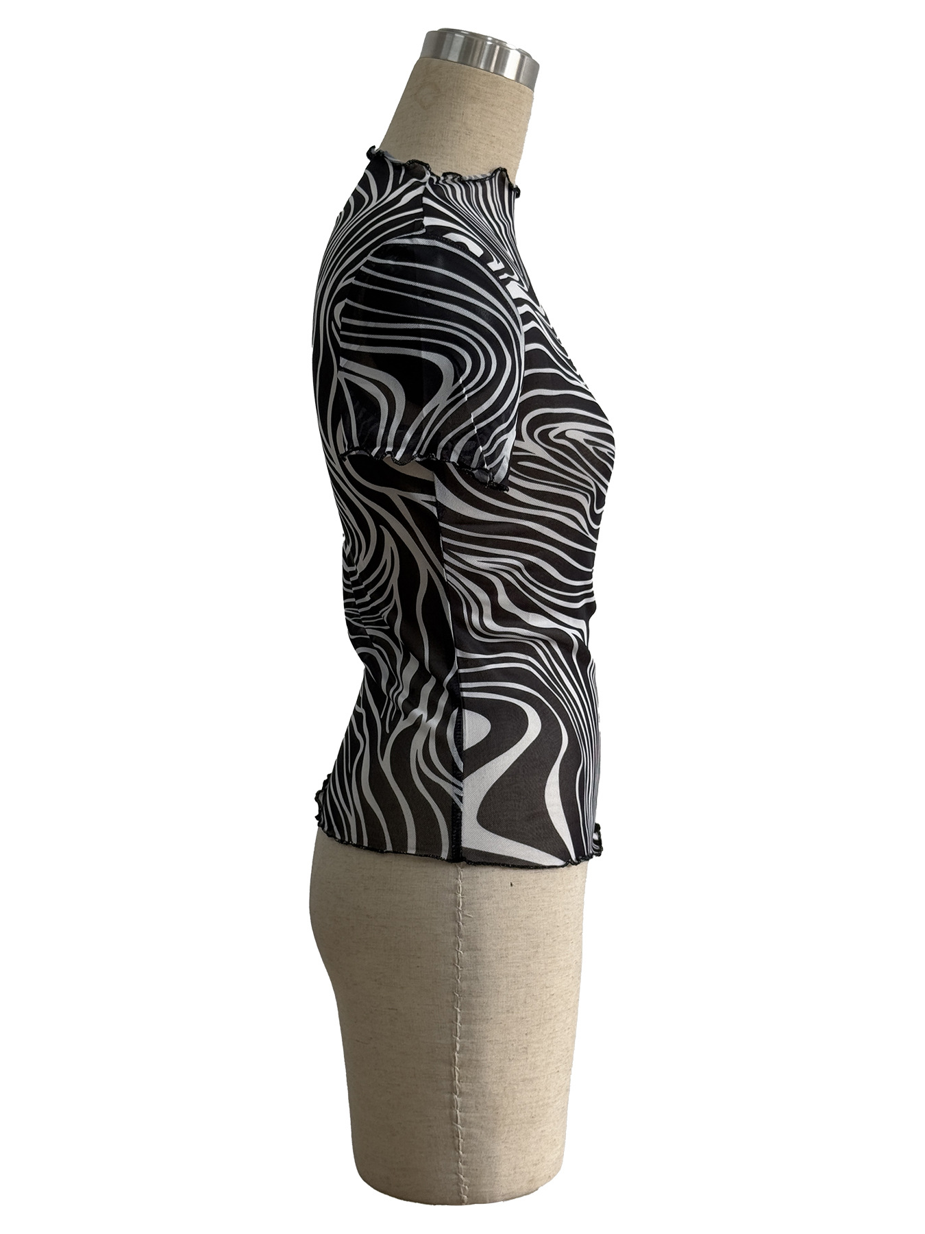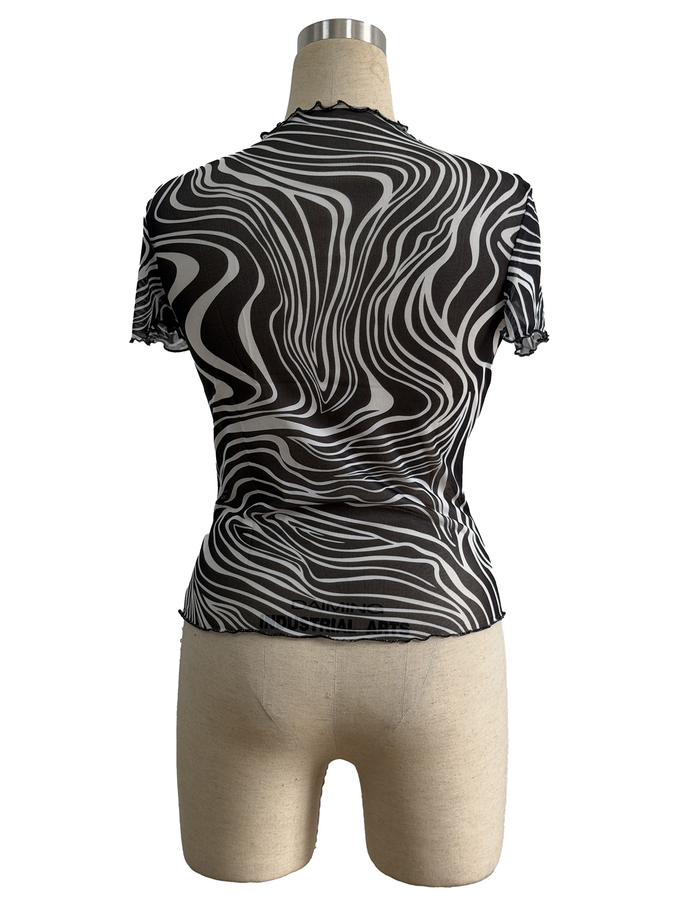 Elegant Womens Mesh Top With Floral Print Striped Design And Ruffle Trim Short Sleeves